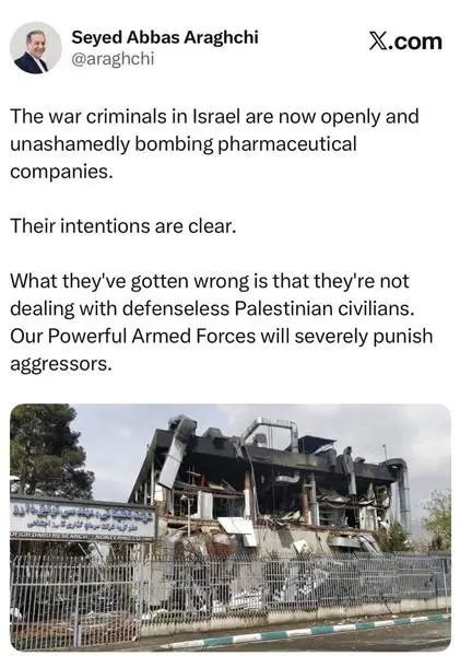 وزیر امور خارجه نوشت؛ جنایتکاران جنگی در اسرائیل اکنون آشکارا و بی‌پرده شرکت‌های داروسازی را بمباران می‌کنند.