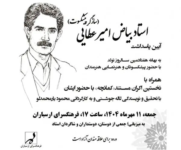 به مناسبت هفتادمین سالروز تولد بیاض امیرعطایی (سازگر پیشکسوت)، آیین پاسداشت این هنرمند نامآشنا با حضور پیشکسوتان، هنرمندان و علاقهمندان جمعه ۱۱ مهرماه ۱۴۰۴ در فرهنگسرای ارسباران برگزار خواهد شد.