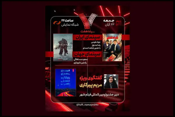 جدیدترین قسمت از برنامه سینمایی «هفت»، امشب جمعه ۲۳ آبان از ساعت ۲۲ به صورت زنده به آنتن شبکه نمایش میرود.