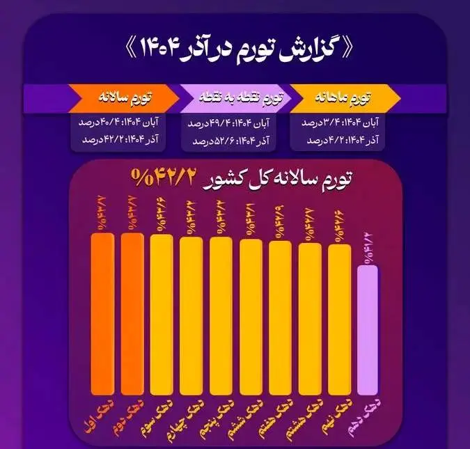 تحریریه آوش/ در آذر ۱۴۰۴، وضعیت تورمی کشور وارد فاز جدید و نگرانکنندهای شد. طبق دادههای مرکز آمار، شاخص کل قیمت مصرفکننده به عدد ۴۳۵.۱ رسید که نشاندهنده جهش ۴.۲ درصدی تنها در عرض یک ماه است. تورم نقطه به نقطه 52.6 درصد، تورم ماهانه برابر 4.2 درصد و تورم سالانه به 42.2 درصد رسید.